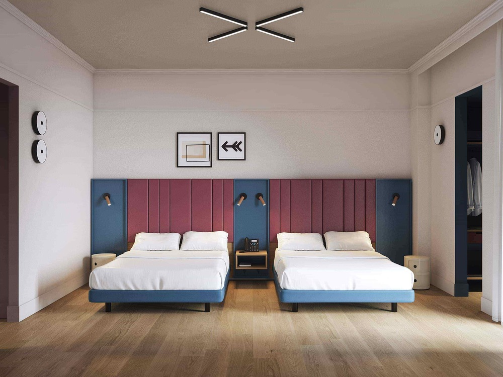 Il nuovo posizionamento si accompagna a un rinnovamento che ha interessato sia gli spazi fisici sia l’identità della struttura. Le 55 camere sono state integralmente ridisegnate attorno al claim “IT’S TIME FOR…”, declinato in varianti tematiche — Fun, Heroes, Good Vibes, Next Adventure, Dreams — e a una palette cromatica che fa perno su azzurro e rosso. Il criterio guida del progetto è l’essenzialità: ambienti funzionali, privi di elementi superflui, in cui il dettaglio selezionato acquista peso proprio per la sua rarità. Ne sono esempio una Moto Morini degli anni ’70 restaurata collocata nella sala ristorante e un pianoforte posizionato nella hall.