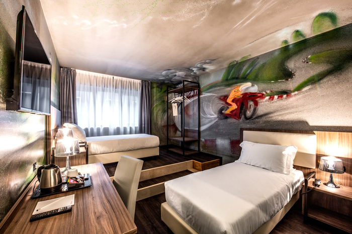 Le 94 stanze dell’hotel sono arredate in stile urban e dotate di tutti i comfort e bagni spaziosi. In ogni camera i murales ricoprono interamente pareti e soffitti. Viverle è immergersi nell’opera d’arte, un’esperienza unica che richiede un rispetto diverso e maggiore di quello che normalmente si deve avere quando si frequenta una struttura ricettiva.