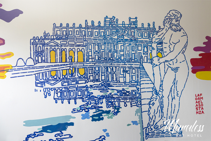 Che non si tratta del solito hotel lo si capisce subito all’arrivo: la facciata, infatti, è impreziosita da un’opera di Mr. Brainwash, l’unica opera muraria in Europa di questo importante artista di fama internazionale che ripropone al Muraless i suoi soggetti tipici: dai classici della Disney alle icone alla Andy Warhol uniti nel messaggio “Love is the answer”. Quale frase più giusta nella città dell’amore di Romeo e Giulietta! All’interno l’arte è addirittura sotto i nostri piedi nel coloratissimo pavimento dipinto da Agron Hoti, artista visuale contemporaneo, protetto da resina trasparente.