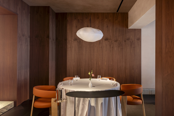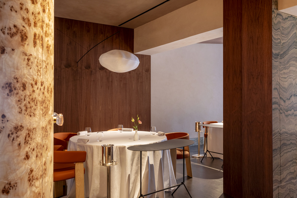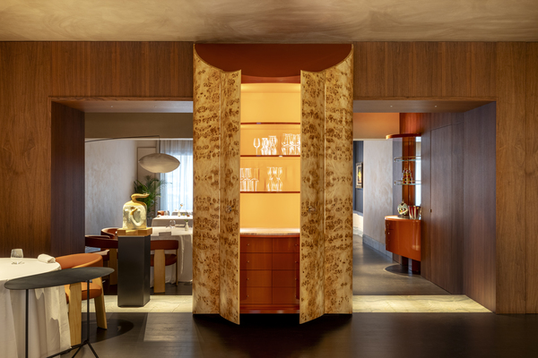 Dall’atmosfera avvolgente della sala principale, con le sue tonalità calde e la vista sul giardino, al pavimento in legno di rovere resinato, alle sedie imbottite in pelle disegnate da Patricia Urquiola color mandarino, ai tavolini di servizio in ferro, fino alle lampade che ricordano le canne da pesca, ogni elemento è stato scelto con cura per creare un’atmosfera di eleganza senza tempo, intrisa di cultura, mai ostentata. I tavoli sono rotondi e ampi, ammantati da tovaglie di lino, per un’esperienza di degustazione elegante. Il marmo cipollino spazzolato corre lungo le pareti delinea a terra una sottile linea d’ombra. L’elemento centrale è un imponente armadio bifacciale in radica di olmo con finitura opaca, che si affaccia su entrambe le sale, le cui forme morbide si contrappongono alla boiserie di noce che le separa, reinterpretando in modo contemporaneo un elemento tradizionale.